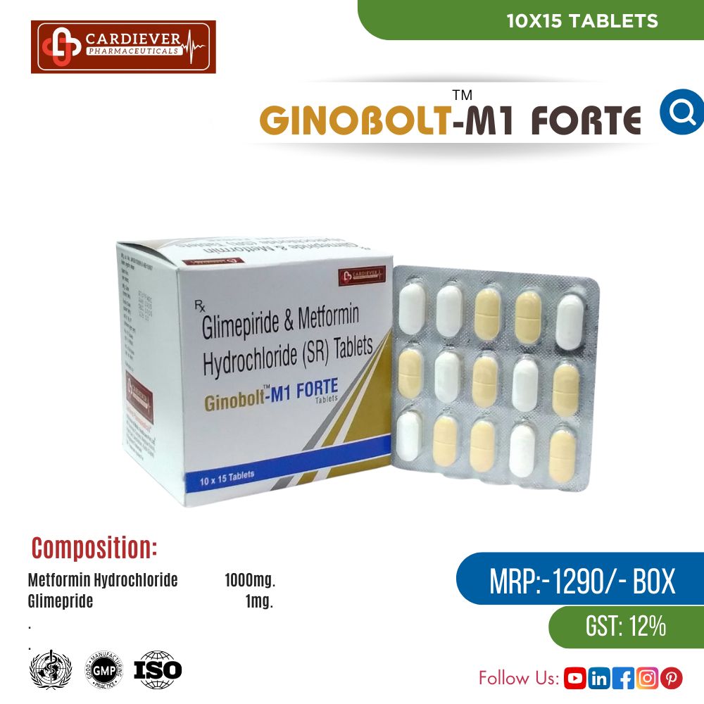Ginobolt-M1 FORTE Tablets combine Metformin SR and Glimepiride—two well-established anti-diabetic agents—to deliver effective blood sugar control in adults with Type 2 Diabetes Mellitus.